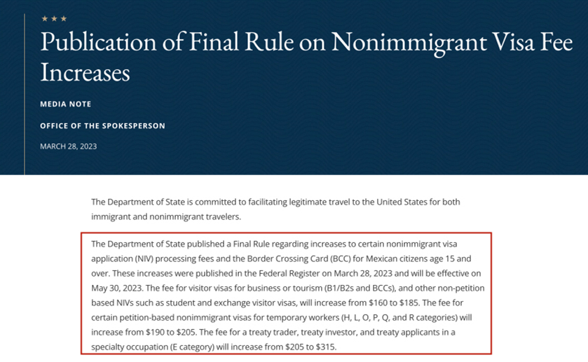 根据美国国务院发布了最新声明显示,美国签证的申请费将集体涨价,其中商务/旅游签证(B1/B2)从原来的160美元上涨至185美元,按照最新的汇率约是1295元人民币。这项涨价规则已于2023年3月28日在《联邦公报》(Federal...